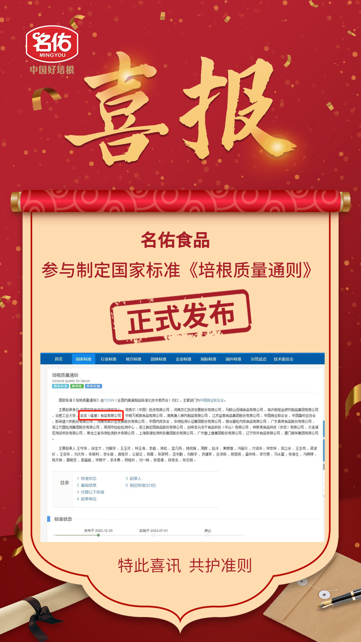 熱烈慶祝名佑食品參與制定國家標(biāo)準(zhǔn)《培根質(zhì)量通則》正式發(fā)布?。。?/h1>